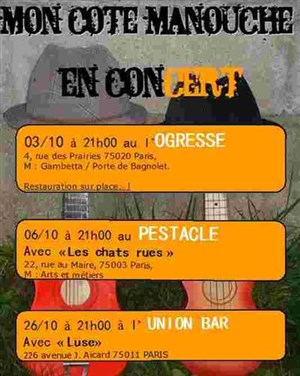 Très bonne soirée en compagnie de ces 2 "usurpateurs" de manoucheries !!! On s'est fait avoir en pensant aller écouter des fans de Birelli Lagrène mais que nenni : Ils te balancent leurs trucs à eux sans prise de tête, avec de la pèche et plein de truculence et je vous assure que ça "envoi" bien. Après une semaine de boulot chargée, nous avons été ravis de ce bon moment de pur bonheur, Allez les voir et les écouter sans hésiter, poilade et détente assurées, en plus musicalement c'est pas mal du tout, on sent qu'ils ont travaillés leur "show" ces deux là. Quand au lieux l'Ogresse, c'est le genre d'endroit à soutenir : le patron Cabilo/Saharien(artiste lui même dans les marionnettes) se débat entre pb de voisins qui ralent et pb financiers (il tient le truc à bout de bras pour ne pas mettre les clés sous la porte), Chapeau bas à lui qui propose un programmation très sympa avec entrèe gratuite contre une conso ... On peut casser la croute sur place, du coup on s'est tapé un petit confit de canard avant le concert qui était bien servi, Non vraiment ça vous booste un samedi soir tout ça .... Eric