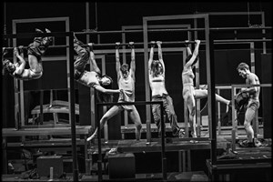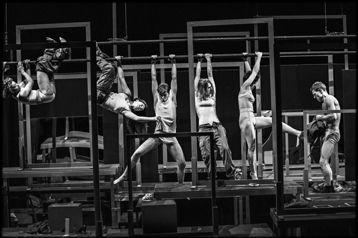 Sur scène, une machine archaïque, abstraite autant qu'absurde, encadre tous azimuts une foule de micro-actions, comme un algorithme compile et code aveuglément des milliards de données (discours, gestes, commentaires).
