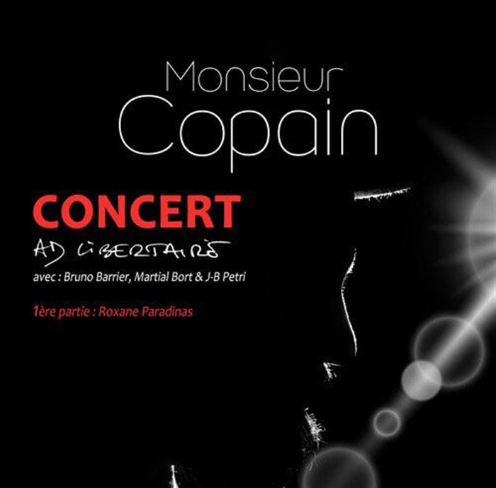 Pour accompagner la sortie de son nouvel EP " AD Libertaire " (Nov.2017) oscillant entre éclats folk-rock et jeux d'ombres blues, Monsieur Copain et ses musiciens ont élaboré un nouveau spectacle résonnant tel un manifeste intimement engagé. Avec : Martial Bort et Bruno Barrier (guitares) et JB Petri (basse, contrebasse)