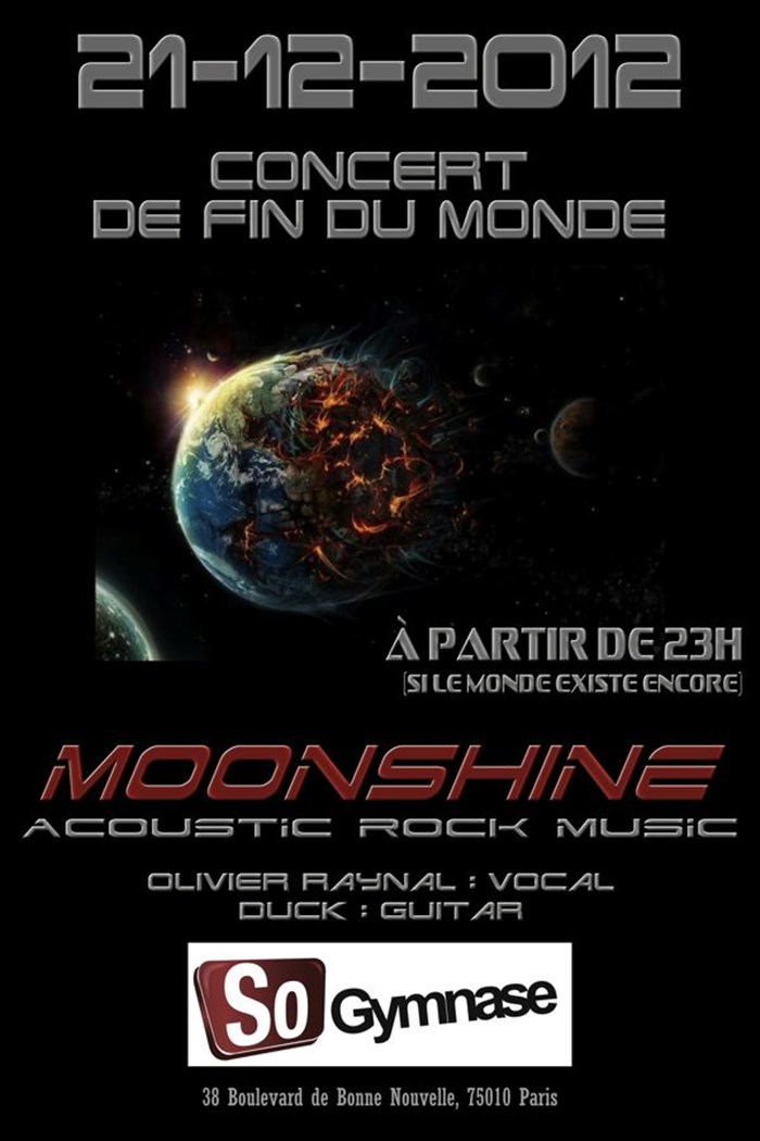 Le peuple Maya l'a prédit, la fin du monde est pour vendredi 21 décembre... Moonshine en concert histoire de ne pas se laisser abattre et de partir avec de la musique dans les oreilles...