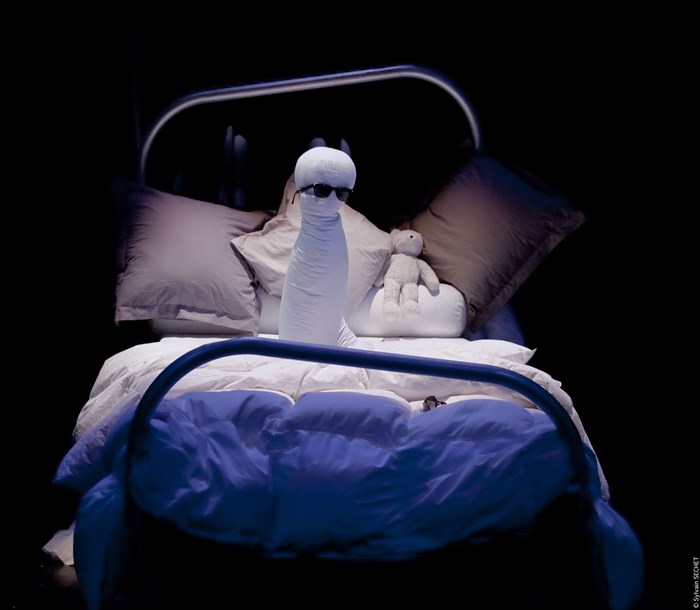 Se coucher n'est pas de tout repos pour un tout petit ; on a beau passer au broyeur de monstres tout ce qui se cache sous, dans et derrière le lit, on n'est pas à l'abri d'étranges créatures... Autour d'un grand lit blanc, Laurent Fraunié, comédien et mime, joue avec des monstres dissimulés un peu partout parmi les objets du quotidien.