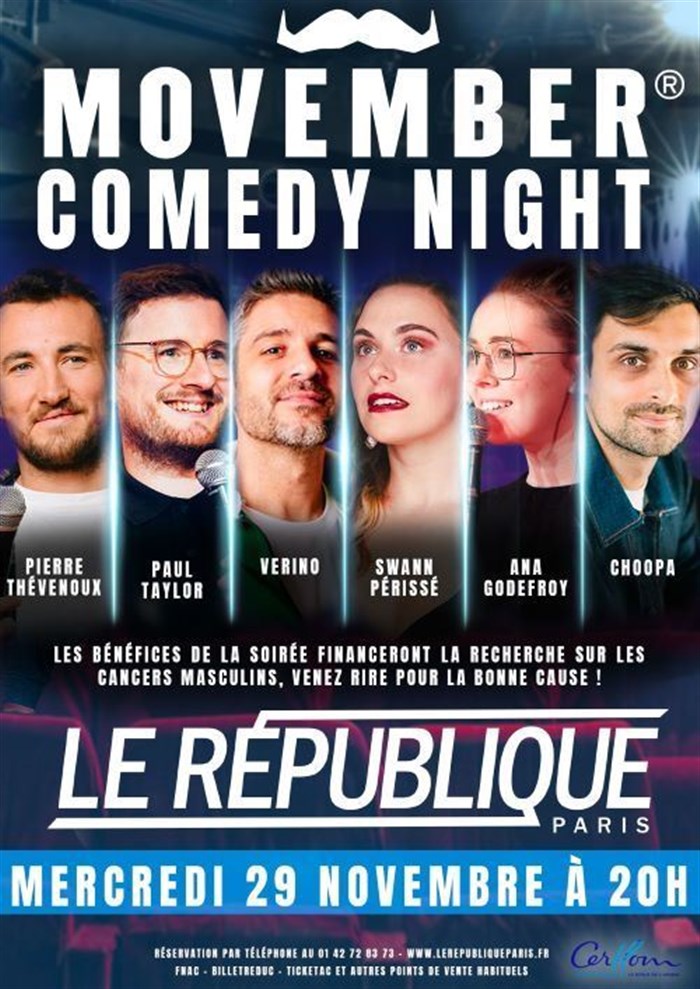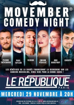 Movember Comedy Night, c'est la première soirée de stand-up au profit de l'association Movember ! RDV au République le mercredi 29 novembre à 20h pour voir tour à tour sur scène : Verino, Paul Taylor, Swann Périssé, Pierre Thévenoux, Ana Godefroy et Choopa. Les bénéfices de la soirée iront financer la recherche contre les cancers masculins (prostate, testicules, ...), la prévention des suicides et la recherche en matière de santé mentale.