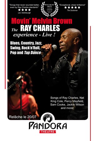 Après le succès des shows précédents et une recente performance à la Sydney Opera House, Movin' Melvin Brown retours à Avignon et sublime l'ascension de Ray Charles vers le succès, avec sa maîtrise de la chanson et de la danse. De Sam Cooke, à Nat King Cole, en passant par Percy Mayfield, Lloyd Price, The Beatles et bien d'autres. Toutes ces influences ont permis a Ray Charles de créer son propre style, s'appropriant ainsi tous les genres musicaux.