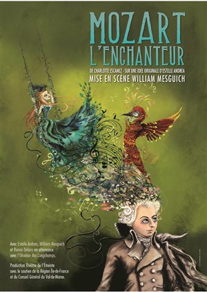 Ma fille de 7 ans s'étant mise à l'alto cette année, le spectacle "Mozart l'enchanteur" m'a paru sympathique pour approcher l'univers de la musique classique de façon ludique. C'est une très jolie pièce mixant le jeu des acteurs, le chant, la musique classique, la projection d'images (jeux d'ombres) en fond de scène, accrochant ainsi l'attention même des plus jeunes. Le spectacle dure 1h et bien que j'aie senti un petit relâchement chez ma fille le dernier quart d'heure, elle a été dans l'ensemble captivée. La salle est très, très agréable, nous qui fréquentons à chaque vacances scolaires les salles pour les plus jeunes, en voici enfin une où les plus petits y voient très bien (amphithéâtre à gradins). La pièce débute sur l'enfance de Mozart et nous fait découvrir son génie précoce pour la composition. Estelle Andrea se partage entre le rôle de Mozart enfant (mutin, drôle, très "frais") et Papagena, l'oiseau bleu, ce qui a forcé l'admiration de ma fille, partie lui demander à la fin de la représentation comment elle faisait pour se changer aussi vite! Papageno, l'oiseau rouge, est très amusant et nous régale autant de sa superbe voix que de son jeu facétieux. Mais j'avoue avoir été impressionnée par le jeu de William Mesguich, se partageant les rôles du père de Mozart quand ce dernier est enfant et le rôle de Mozart lui même, plus âgé. Il interprète un "papa-Mozart" fier de son enfant, l'aimant, l'entourant, l'encourageant, le poussant toujours plus haut, mais aussi un père étouffant, directif et allant à l'encontre du génie créatif de son fils. Ce même interprète reprend ensuite le rôle de Mozart jeune adulte, "feu follet musicien", souffrant de ne pouvoir exprimer son art librement, et nous fait assister à la création de la "Flûte enchantée". M.Mesguich habite ses deux rôles, il a une présence très forte sur scène de par son regard et sa voix, une diction qu'on lui envie! Qui plus est, il a eu la gentillesse de signer l'affiche de la pièce et discute avec son jeune public. Peut-être pour les plus jeunes serait-il conseillé de raconter un peu à son enfant la vie de Mozart avant de se rendre au spectacle, mais il est dans l'ensemble très accessible au jeune public. Nous nous sommes régalées et vous le conseillons si vous souhaitez faire une sortie non seulement sympa mais aussi éducative!