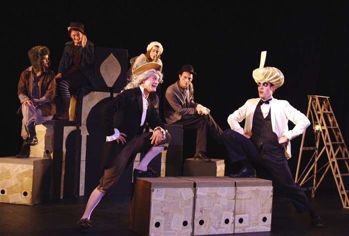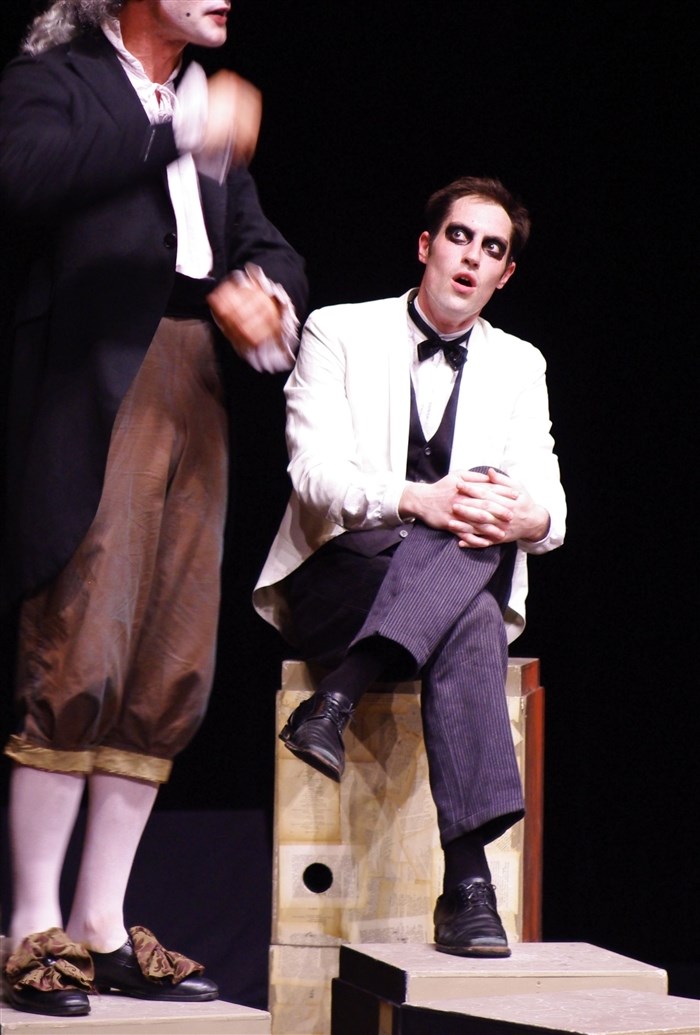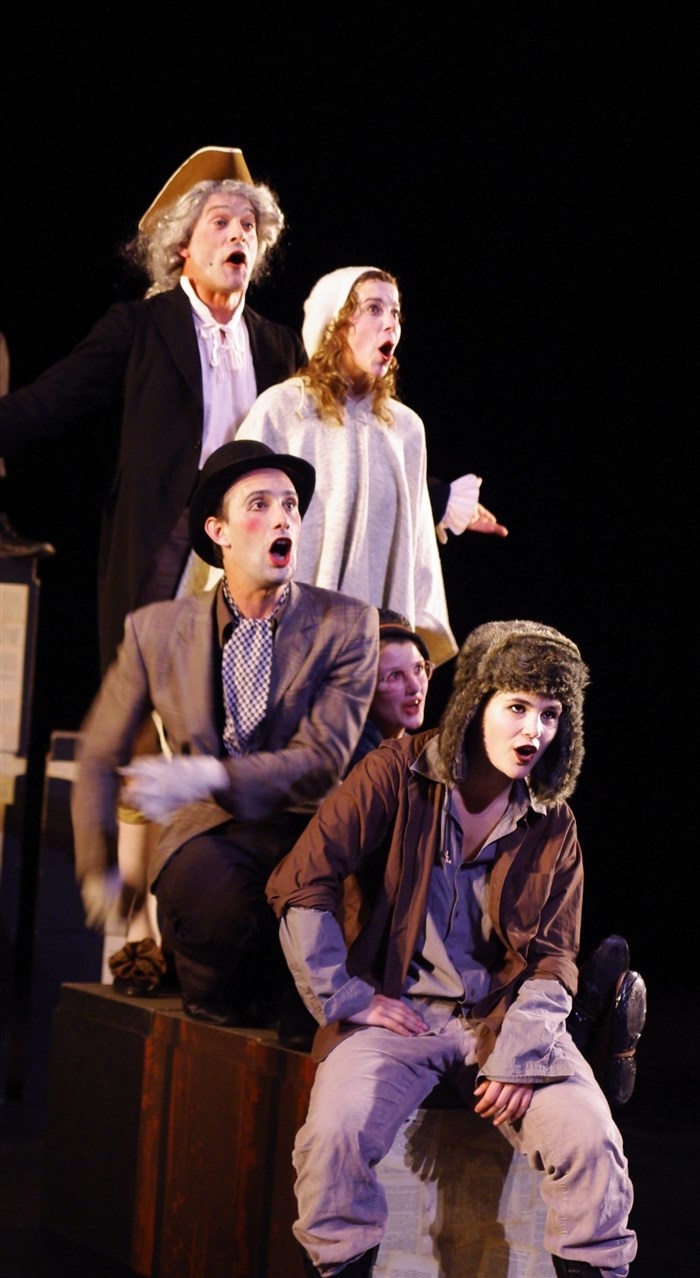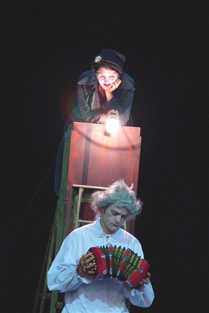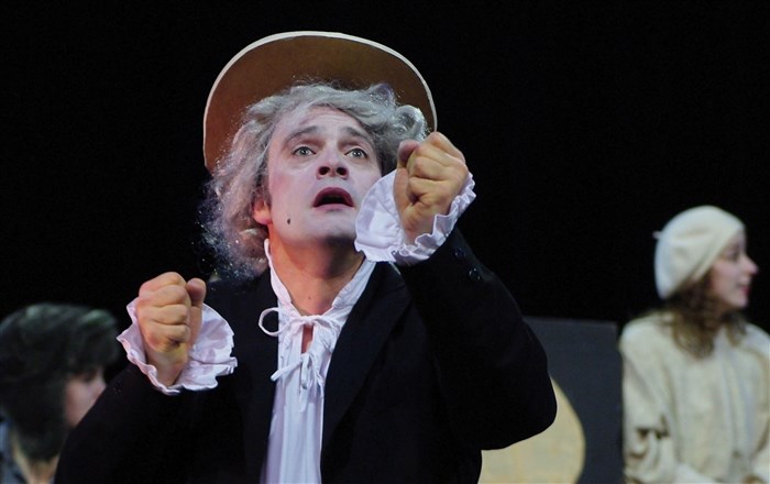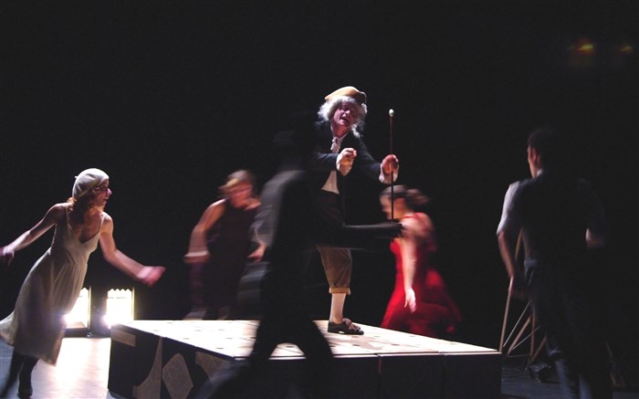 Des personnages tragiques et clownesques se livrent une lutte à la fois cruelle et dérisoire sur la scène du Baron de Münchhausen.