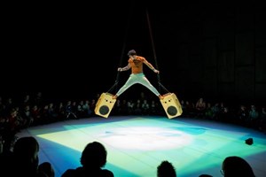 Murmur invite enfants et parents, munis de sacs à dos chantants, à suivre les évolutions d'un acrobate, au sol comme dans les airs.