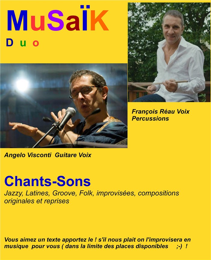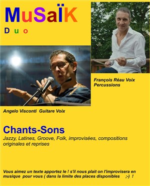 Musaïk duo, c'est nouveau et c'est très Chants-Sons : 2 voix, une guitare, un Cajon, des percus. De quoi faire voyager en profondeur et en légèreté.