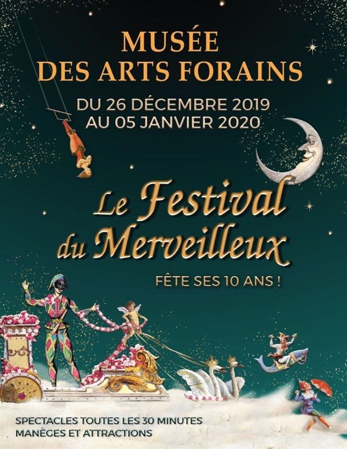 À l'occasion des 10 ans du Festival du Merveilleux, le Musée des Arts Forains vous accueille dans une grande folie carnavalesque. Le spectacle sera partout et ponctue la déambulation des spectateurs. De nombreux impromptus sont proposés toutes les 30mn : musiciens, féérie aériennes, clown burlesque, danse tanoura...