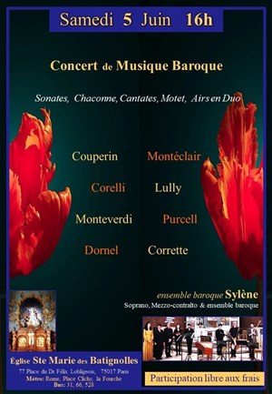 Par l'ensemble baroque Sylène : Soprano, Mezzo-contralto & ensemble baroque, 2 violons baroques, théorbe, violone, viole de gambe, clavecin.