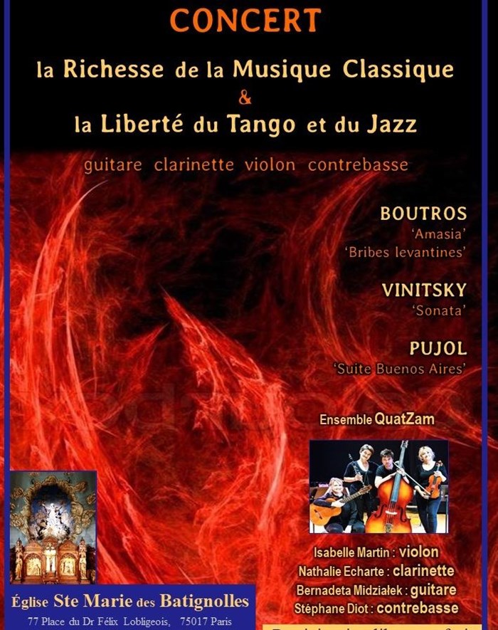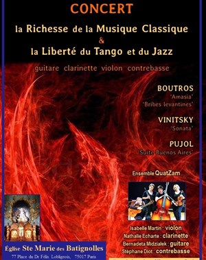 la Richesse de la Musique Classique et la Liberté du Tango et du Jazz pour guitare clarinette violon et contrebasse.