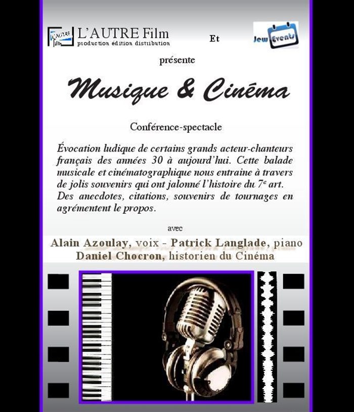 Spectacle interprété par Daniel Chocron, historien du Cinéma - conférencier, Alain Azoulay au chant et Patrick Langlade au piano.