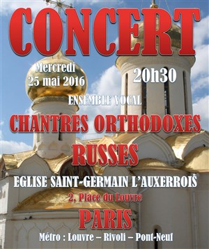 Un grand concert de chants orthodoxes russes sera donné en l'église Saint-Germain l'Auxerrois à Paris, non loin du Louvre et du Pont-Neuf par l'ensemble vocal masculin " Chantres Orthodoxes Russes ".