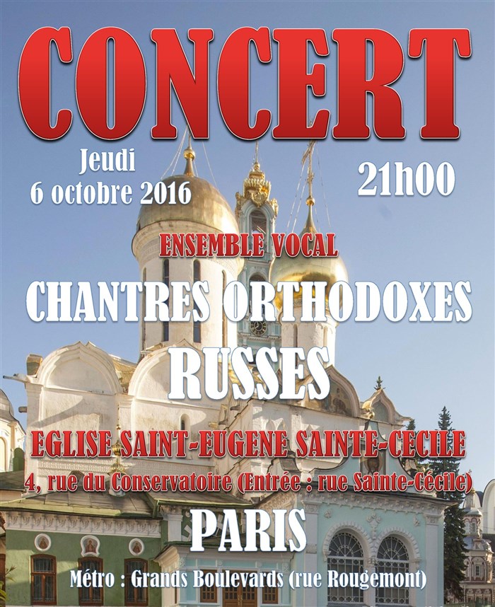 Un grand concert de chants orthodoxes russes sera donné en l'église Saint-Eugène Sainte-Cécile à Paris, à deux pas des grands boulevards par l'ensemble vocal masculin " Chantres Orthodoxes Russes ".
