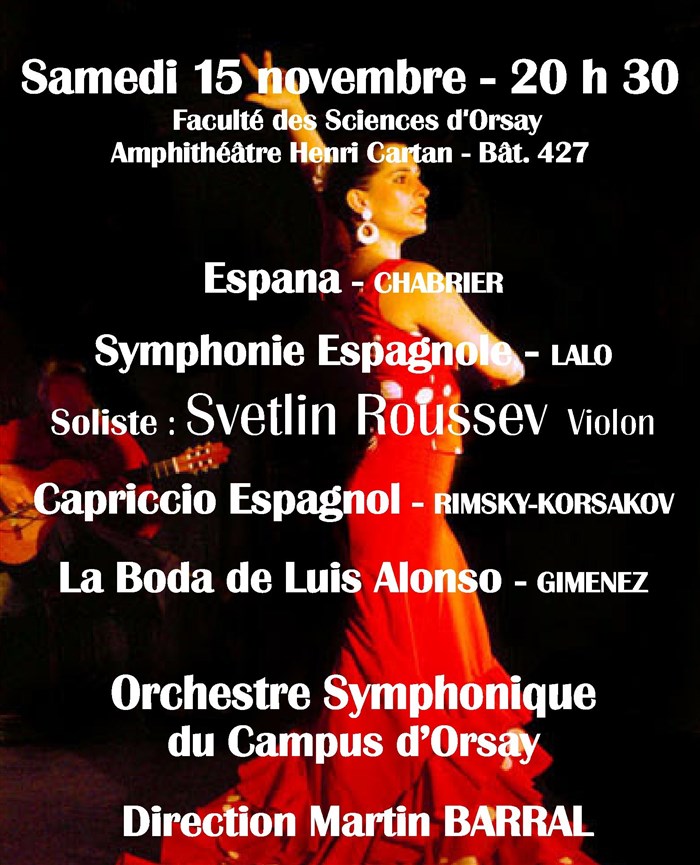 La "Symphonie Espagnole", d'Edouard Lalo, qui est en réalité un concerto pour violon dédié au grand virtuose Sarasate, sera jouée en soliste par Svetlin Roussev, premier violon solo de l'orchestre philharmonique de Radio France et professeur au CNSM de Paris.