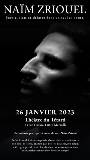 Naïm Zriouel, fusionnant poésie, slam et théâtre, vous invite à son seul en scène.