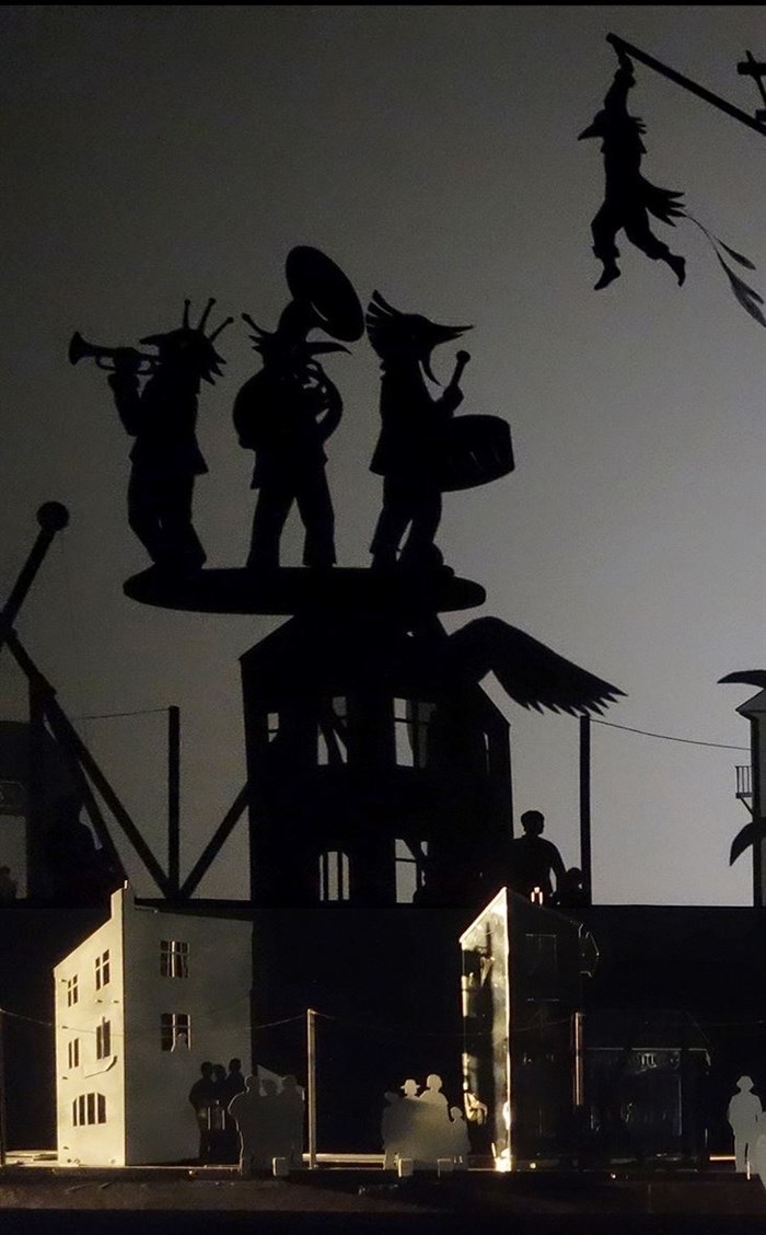 Sur scène, à la vue des spectateurs, les manipulateurs éclairent les différents décors et personnages de l'histoire installés sur des supports mobiles. Leurs ombres se projettent en grand sur un écran situé en fond de scène. Les yeux du spectateur sont donc attirés tour à tour par les décors, leur image agrandie projetée en ombre sur l'écran, le jeu théâtralisé des manipulateurs et les musiciens en live sur le plateau. Ces lectures entremêlées permettent aux spectateurs d'assister en direct à la fabrication de l'histoire.