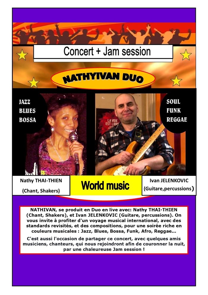 Nathivan, se produit en Duo en live avec: Nathy Thai-Thien (Chant, Shakers), et Ivan Jelenkovic (Guitare, percussions). Dès 20h30, on vous invite à profiter d'un voyage musical international, avec des standards revisités, et des compositions, pour une soirée riche en couleurs musicales : Jazz, Blues, Bossa, Funk, Afro, Reggae...