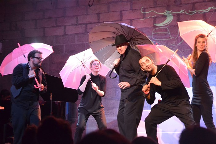 À chaque représentation : 5 comédiens-chanteurs, 3 musiciens, 1 illustrateur, le maître de cérémonie et vous ! C'est vous qui décidez du titre, du lieu et des rebondissements de l'aventure.
