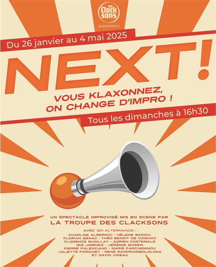 J'avais déjà vu un match d'impro mais jamais un spectacle comme celui-là. Les comédiens et comédiennes enchaînent spontanément des impros sous le contrôle des spectateurs munis de... klaxons ! L'idée est à la fois simple et géniale. On est tout de suite pris au jeu et on est facilement embarqué dans les différents univers. J'ai adoré l'inventivité renouvelée à chaque fois. C'est drôle mais pas seulement, j'ai été surprise par des scènes inattendues et émouvantes. Avec leur énergie communicative et leur complicité, ça revigore et ça a ensoleillé mon dimanche pluvieux !