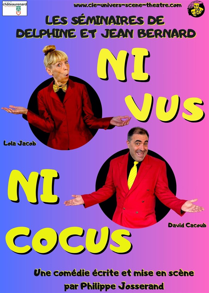 Être cocu n'attend pas Mesdames et Messieurs ! Bienvenue à notre grand séminaire annuel proposé par Delphine et Jean Bernard. Les spectateurs participants sont invités à ce grand rassemblement pour une cure de désintoxication. Delphine et Jean Bernard vous conseilleront de manière pédagogique et avec une série de sketches hilarants, burlesques sur les infidélités et les tromperies en tous genres. Ainsi ils vous permettront de détecter un adultère tout en finesse et en humour. Voici la grande aventure de la vie de couple qui vous rappellera certainement des situations trompeuses à ne reproduire sous aucun prétexte. Vous réaliserez alors que l'amour, Mesdames, Messieurs, qu'il soit à deux ou à trois voire à quatre, reste éternel. Bienvenue à " Ni Vus... Ni Cocus... " avec 1h15 de rire garantie.