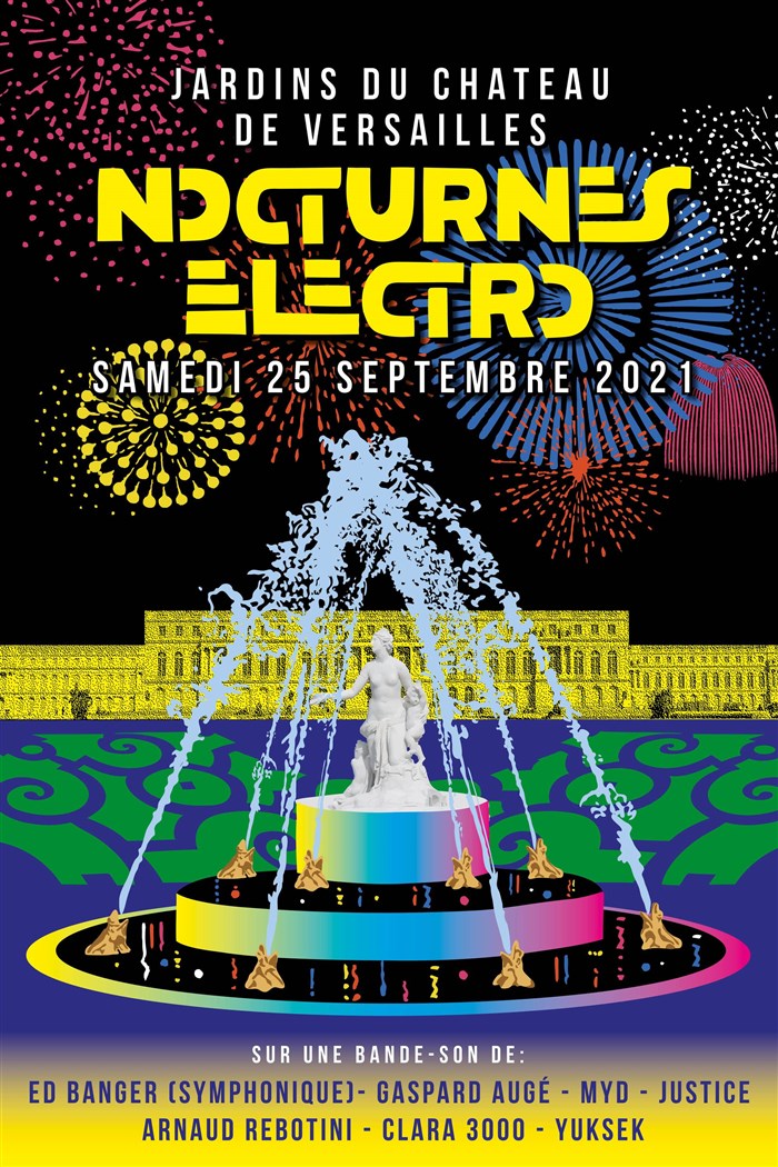 Le 25 septembre 2021 et pour la première fois, les Jardins Royaux du Château de Versailles se parent de mille feux et vous invitent à un voyage à travers le temps au rythme de la musique électro de d'Ed Banger (symphonique), Gaspard Augé, Myd, Justice, Arnaud Rebotini, Clara 3000 et Yuksek !
