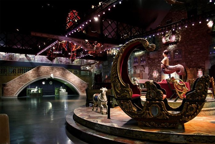 Un jardin, un lustre de cristal suspendu à son toit de verdure. Une fontaine magique, une montgolfière éléphant et une fête foraine avec ses manèges de chevaux en bois.