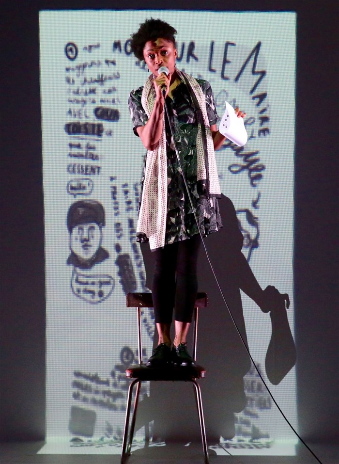Sur scène, une comédienne et une dessinatrice font avancer le récit à la manière d'un "roman graphique théâtral".