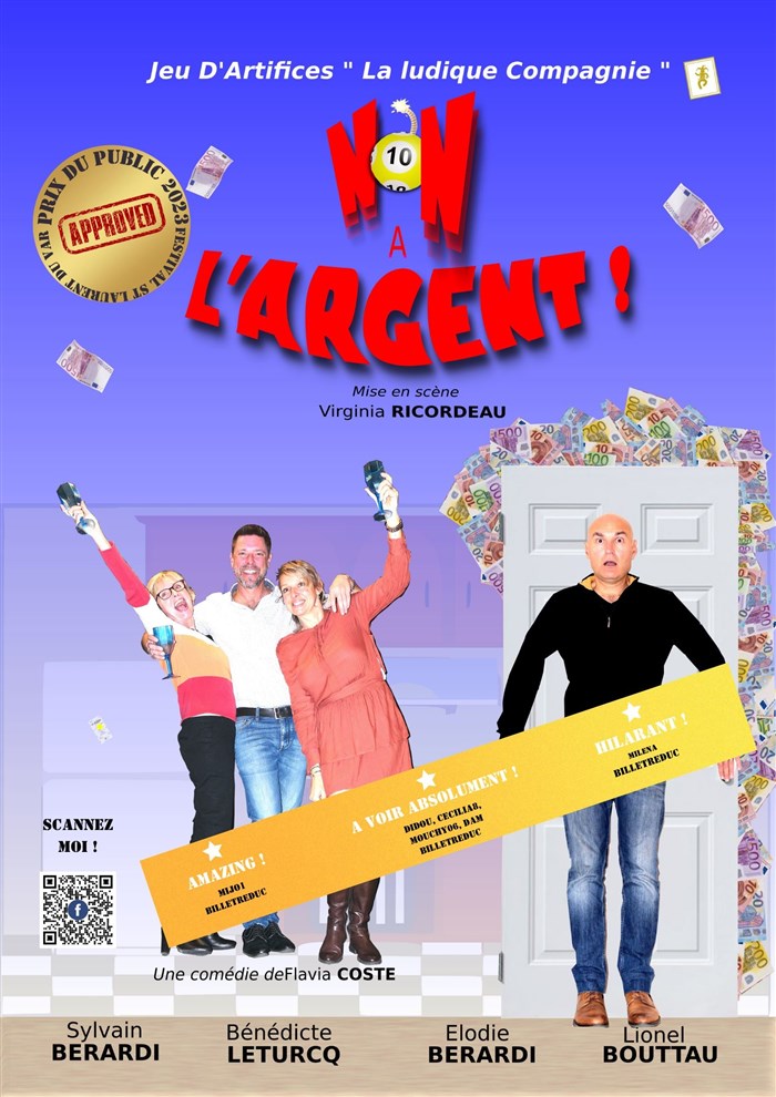 Un super moment !! Bravo aux comédiens pour qui, parfois, tenir le rôle n'est pas évident !! Il y avait tout ce qu'il faut, mais surtout de l'humour et une caricature quasi complète de ce que l'argent pourrait provoquer chez chacun de nous !! Je recommande sans réserve !!