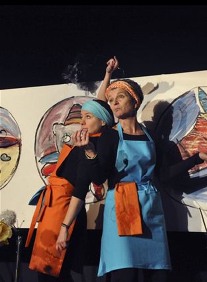 Une conteuse et sa complice racontent,dansent,chantent et peignent ensemble une fresque qui naît sous le regard du public et répond aux histoires.