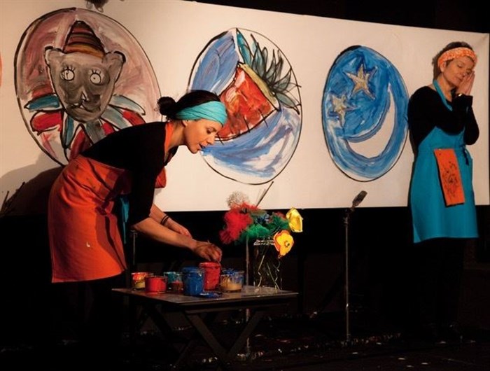 Gael et Anne racontent, dansent, chantent, et peignent les aventures de Julie et de Petit Ours. Une fresque de 5m x 1m apparait en direct !
