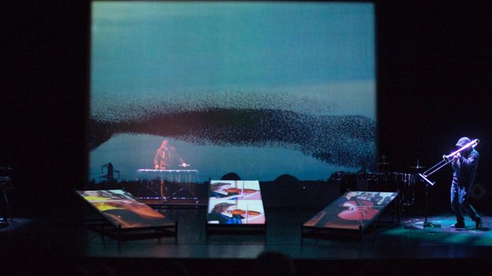 Sur scène, trois musiciens chantent et s'emparent de marimbas, peaux, piano, contrebasse, trombone, guitare, steel-drums, percussions corporelles en investissant sans cesse tous les agrès scénographiques. Rejoints par une foultitude de " guests " virtuels, ils enrichissent leur musique de voix lyriques jouxtant des chanteuses death-metal, de beatboxing croisant le dodécaphonisme, de choeurs se mêlant aux cordes en passant par les percussions corporelles...