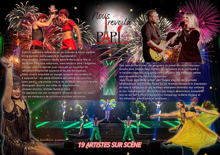 Laissez-vous transporter par un tourbillon de sensations emplies de couleurs et de joie contagieuse. Nous vivrons ensemble un voyage temporel des années 20 à aujourd'hui : un siècle d'histoire parisienne rien que pour votre plaisir. Une excuse unique de retrouver Maurice Chevalier, Mistinguett, Bourvil, aux côtés de Yves Montand, Jacques Dutronc et Michael Bublé et Zazie.