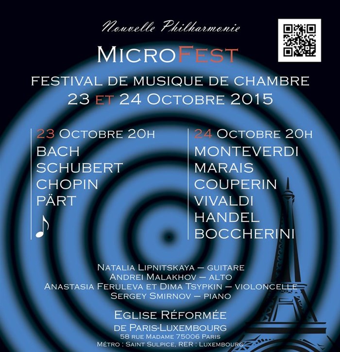 CONCERT 2 Titre de l'événement : Nouvelle Philharmonie "MicroFest" Artistes : Anastasia Feruleva et Dima Tsypkin - violoncelles Natalia Lipnitskaya - guitare Andrei Malakhov - alto Sergey Smirnov – piano Lieu : Temple du Luxembourg 58 rue Madame 75006 Paris Date : samedi, 24 octobre, 20 heures. Programme : Monteverdi, Marais, Couperin, Vivaldi, Handel, Boccherini Tarifs : 20 Euros, 30 Euros pour les deux concert Entrée gratuite pour les enfants de moins de 12 ans Site internet : www.nouvellephilharmonie.com.com