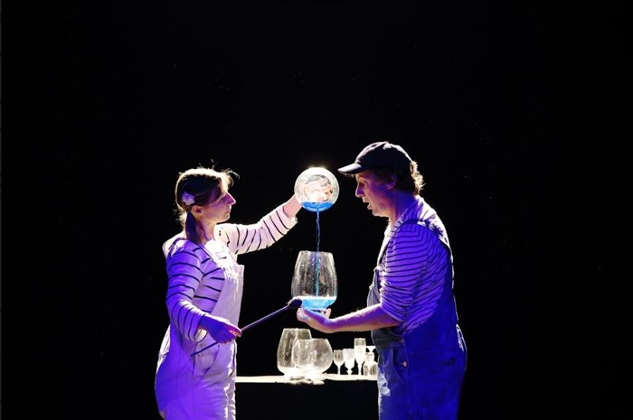 Le premier souffle de la vie commence avec l'eau et le son, viennent ensuite le mouvement et la parole .... Clapotis, murmures, chants .... L'humour est également présent à travers les facéties des deux personnages, complices et complémentaires.
