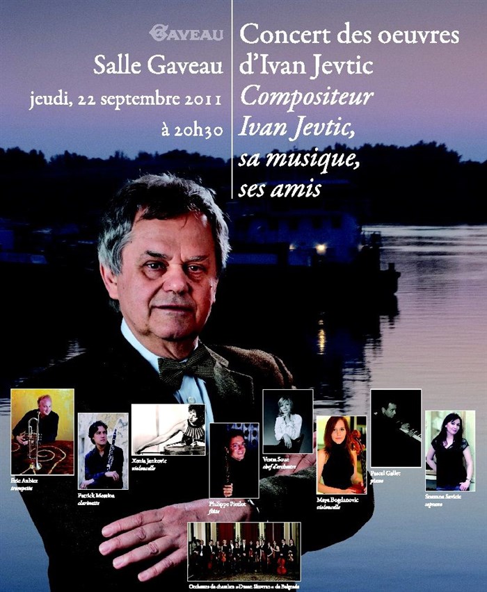 Ce sont les plus belles partitions du compositeur franco-serbe Ivan Jevtic qui seront jouées par une pléïade d'artistes Français et Serbes de tout premier plan qui seront jouées en ouverture de saison à la Salle Gaveau : Eric Aubier ( trompette ) , Patrick Messina ( clarinette ), Philippet Pierlot ( flûte ), Pascal Gallet ( piano ), Snezana Savicic ( soprano ), Maya Bogdanovic ( violoncelle ), Vesna Souc ( chef d'orchestre ). 28 artistes sur scène...