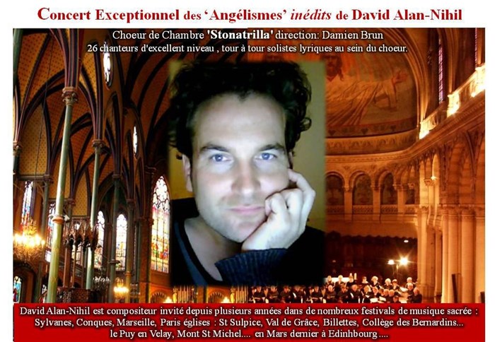 David Alan-Nihil est compositeur invité et interprété depuis plusieurs années dans de nombreux festivals de musique sacrée : Sylvanes, Conques, Marseille, Paris églises : St Sulpice, Val de Grâce, Billettes, Collège des Bernardins... le Puy en Velay, Mont St Michel.... en Mars dernier à Edinbourgh ....