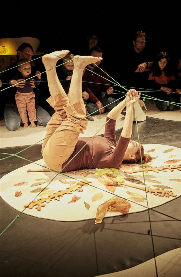 Oka invite les petits spectateurs, sur des îlots sensoriels, à se saisir des objets et des matières brutes évoquant la nature mis à leur disposition.