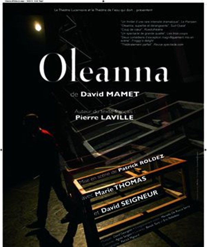 Ce huis clos magistral est une adaptation de la pièce de David Mamet, dramaturge juif américain dont les parents sont des immigrés russes. Ce détail est important puisque la pièce repose sur un argument social : celui de l'intégration des étudiants modestes au sein de l'université américaine. On voit qu'une transposition dans le cadre français est délicate puisque le prix des études supérieures en France n'a rien à voir avec celui des études dans les universités d'outre-Atlantique. En outre, la confrontation, le tête-à-tête avec une étudiante est spécifiquement nord-américain, un bureau étant dédié aux professeurs dans ce but. Cela étant, cette pièce va bien au-delà d'un simple différend entre un homme et une femme. Elle est une réflexion profonde sur le pouvoir, une parabole qui dérive vers de nombreux thèmes qu'il serait trop long de développer ici. Retenons-en un : le procès. Car c'est bien de cela qu'il s'agit. Dans la première partie, l'étudiante Carol est comme une pile, elle accumule tous les éléments qui vont faire d'elle un procureur au cours d'une deuxième partie, surprenant renversement de situation. A-t-elle prémédité sa vengeance ? À chacun d'en décider. Lequel des deux est finalement le vrai coupable ? Ni l'un ni l'autre ? Reste la réflexion sur une société paternaliste, sur un dilemme qui se conclut par une violence physique extrême, violence d'un homme sur une femme, qui reste malheureusement d'une brûlante actualité trente ans après la rédaction de ce texte. La jeune Nadia Nouel Sharshar (qui joue en alternance avec Roxane Davidson) est parfaite d'intériorité. Elle élève peu la voix, mais ses mots sont comme des couperets. Kevin Gouabault interprète à merveille le maître, sûr de ses prérogatives, mais désarçonné par l'issue d'un entretien qui semblait de simple routine. La mise en scène de Violette Erhart est sobre (comme à l'origine), un simple bureau, mais l'intelligence de l'éclairage transfigure l'action et lui donne une crudité parfaitement réussie. Un superbe moment d'émotion, captivant. À ne manquer sous aucun prétexte.