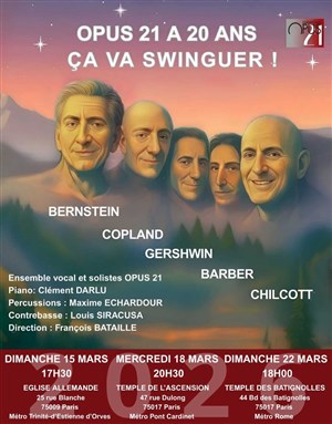 Découvre Opus 21 à 20 ans ça va swinguer !, qui fait partie de notre sélection d’événements de type Musique classique et qui se tient ici : Temple des Batignolles -