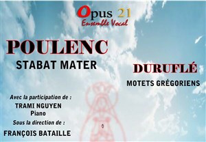 L'ensemble vocal Opus 21, composé de 24 chanteurs, placé sous la direction de François Bataille propose cette année un programme consacré à la musique vocale sacrée française du 20e siècle, avec 2 compositeurs emblématiques : Francis Poulenc et Maurice Duruflé. L'ensemble donnera notamment le Stabat Mater de Poulenc à 5, 6, 7 et 8 voix, accompagné au piano par Trami Nguyen.