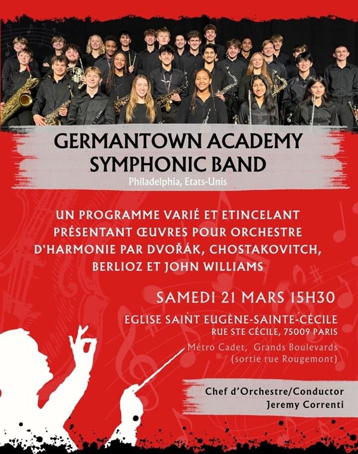 Le Germantown Academy Symphonic Band est un ensemble dynamique composé des élèves musiciens de la Germantown Academy de Fort Washington, en Pennsylvanie. S'appuyant sur une riche tradition éducative remontant à 1759, l'ensemble mêle chefs-d'oeuvre classiques et répertoire contemporain pour orchestre à vent, offrant des prestations marquées par leur énergie, leur précision et leur profondeur expressive.