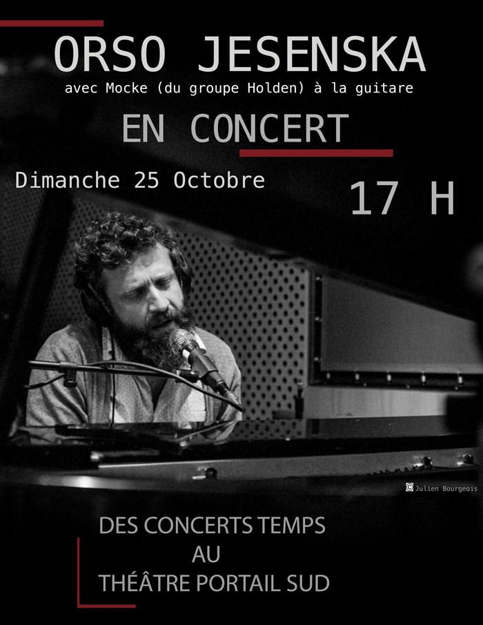 Orso Jesenska est un artiste d'une grande finesse musicale que vous aurez le bonheur de découvrir au théâtre Portail Sud. Son l'inspiration le rapproche de Dominique A. Il sera accompagné pour ce concert par le guitariste virtuose Mocke Depret (du groupe Holden).