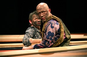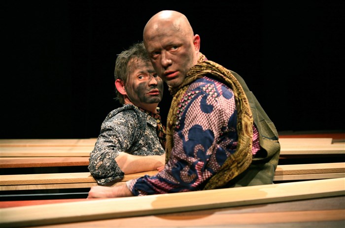 Les deux acteurs, vêtus de caleçons longs ridicules, exposent leur rivalité avec agilité. Alors que la scène se déglingue concrètement, un troisième acteur apparaît. Comédien au teint basané, placé en marge du plateau, voilà qu'il revendique une place à part entière sur cet échaffaudage, serait-ce le véritable Othello qui entre en scène ?