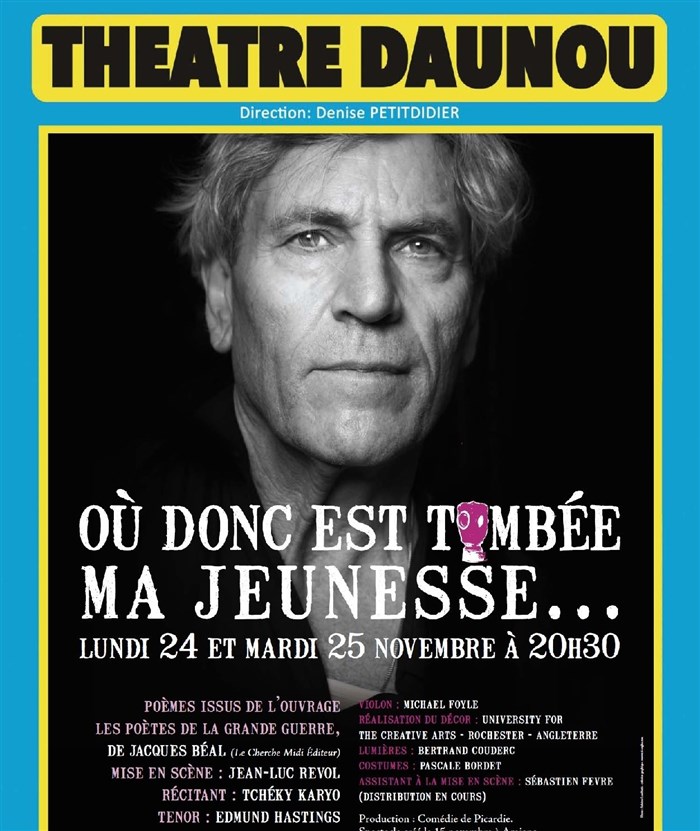 spectacle de belle et intense qualité ou Tchecky Karyo parvient, au travers des poèmes qu il pétrit dans sa chair et fait entendre par sa voix, a extirper des boues malodorantes de cette immonde boucherie, la fleur éclaboussée d espoir et de poésie.Les deux jeunes musiciens virtuoses ( piano et violon) portent du bout des doigts les noires sonorités de la mélancolie.Le jeune ténor anglais, sanglé dans son lourd uniforme,passe de l ombre à la lumière et son interprétation des "roses de Picardie"m a touchée comme un obus en plein coeur.La mise en scène de Jean LUc Revol est sublime et percutante.Tout dans ce spectacle est d intelligence de coeur et nous fait ressentir que, sous les décombres de l horreur, le moindre geste d amour, le moindre filet d espoir qui ne soit pas de sang et de larmes donnait à cette jeunesse sacrifiée,ses armoiries de gloire.La poésie du désespoir....le plus beau" chant" pour la bataille!