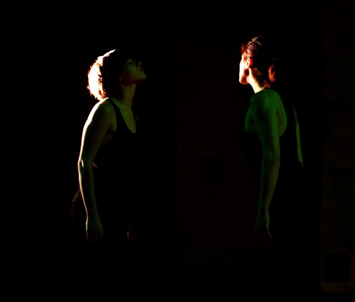 Dispositif pour 2 danseuses et une éclairagiste. Il est question de se confronter ici au désir et à l'attraction avec pudeur.