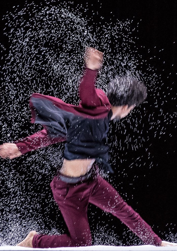 Sur un plateau rebondissant recouvert d'une multitude de petites billes légères, deux hommes en costume s'élancent, rebondissent et tourbillonnent dans les airs. Ils tombent et se relèvent et font voler tout autour d'eux les minuscules particules. La chute est le moteur de la chorégraphie et la danse, tour à tour aérienne et percutante, fait naître des tableaux hypnotiques.