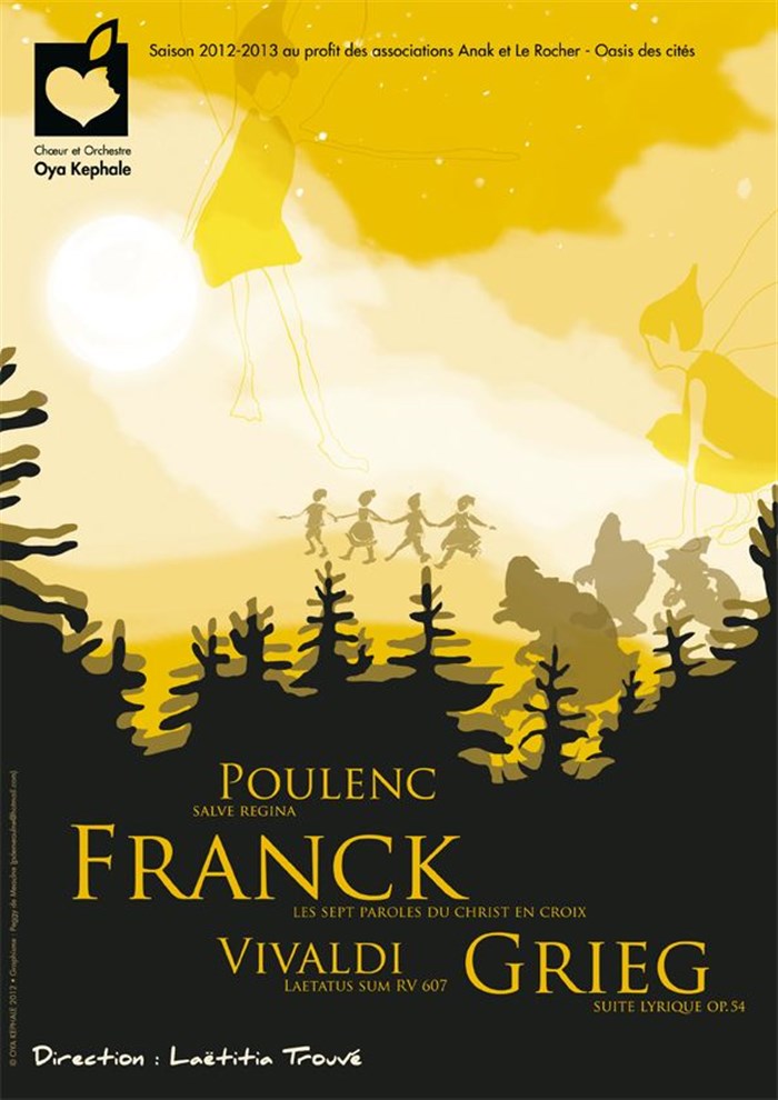 Oya Kephale vous propose trois mouvements de la Suite lyrique op.54 pour orchestre d'Edvard Grieg, le Salve Regina de Francis Poulenc pour choeur mixte a cappella, puis Les sept paroles du Christ en croix pour choeur, orchestre et solistes de César Franck et le Laetatus sum RV 607 pour choeur et orchestre d'Antonio Vivaldi.