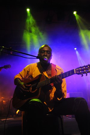 Seul avec sa guitare et ses textes émouvants, son nouveau spectacle "Gaindé N'Diaye", dédié aux êtres chers disparus, surprend et envoûte