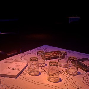 Sont disposés des tables et des livres, sous une lumière tamisée, les spectateurs sont invités à prendre place autour d'un verre.