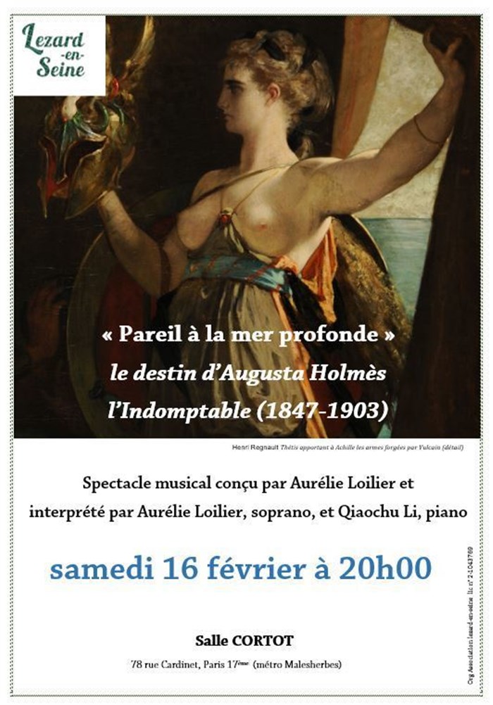 Cette musicienne composa plusieurs symphonies, sept poèmes symphoniques, pas moins de 180 mélodies, et même un opéra " La Montagne noire " qui fut donné à l'Opéra de Paris de son vivant. Elle côtoya Richard Wagner et César Franck qui furent ses maîtres, Charles Gounod, Hector Berlioz, Stéphane Mallarmé, Alfred de Vigny (son parrain), Henri Regnault (qui la représenta victorieuse et poitrine nue dans Thétis apportant à Achille les armes forgées par Vulcain, ce qui, en 1866, valut le Prix de Rome au peintre mais déclencha aussi un des premiers scandales autour d'Augusta), Catulle Mendes (qui était déjà marié mais avec qui elle eut néanmoins cinq enfants !!), Franz Liszt, Camille Saint-Saëns, pour ne citer qu'eux...